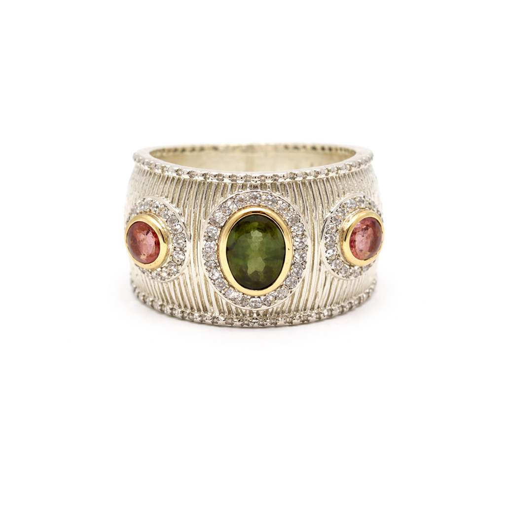La bague Tessa est en laiton plaquée argent avec une tourmaline verte au centre et 2 tourmalines roses sur les côtés.